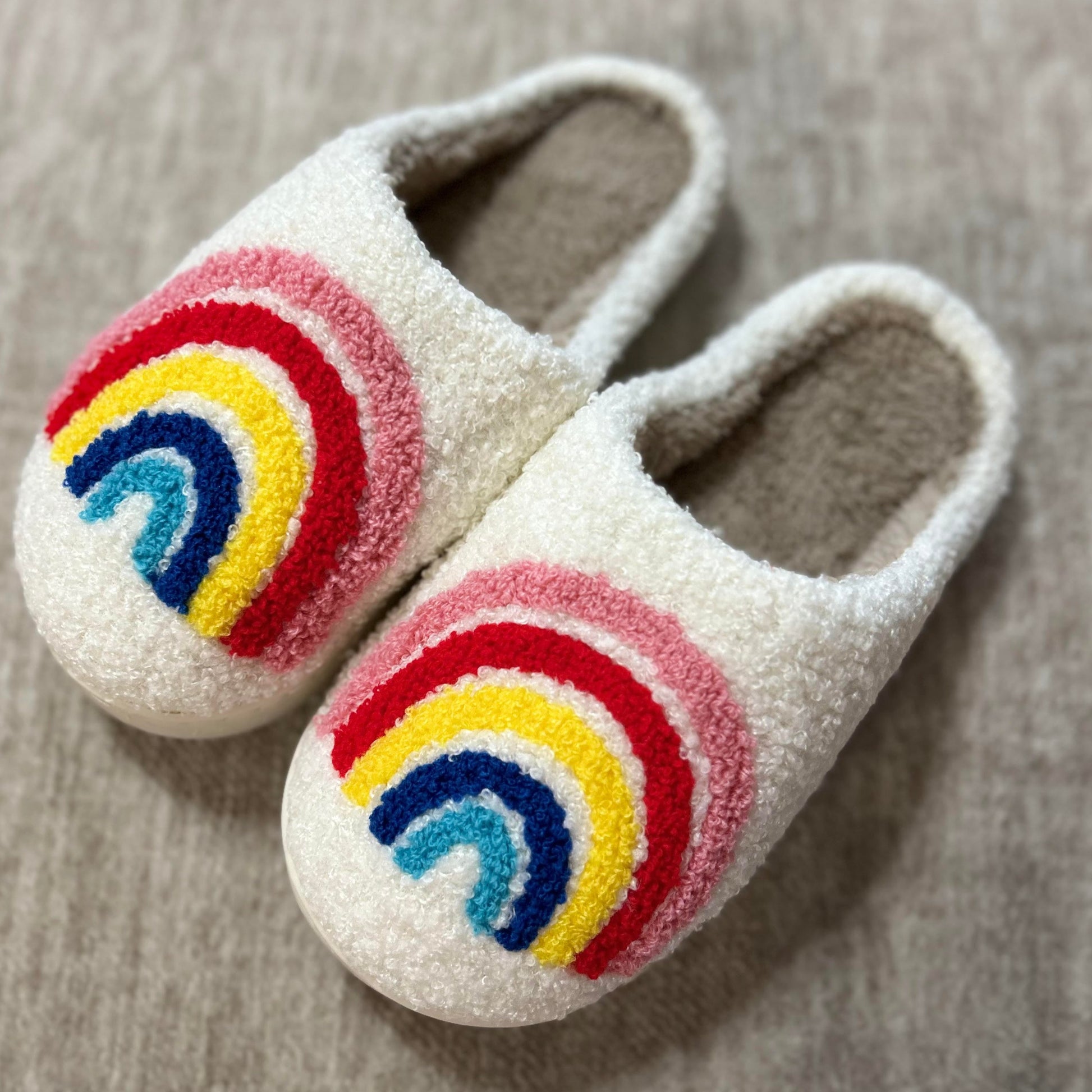 The TRENDING Smiley Slippers, but rainbow patterned! Plush and great to wear around the house (Or even to the local dollar store)